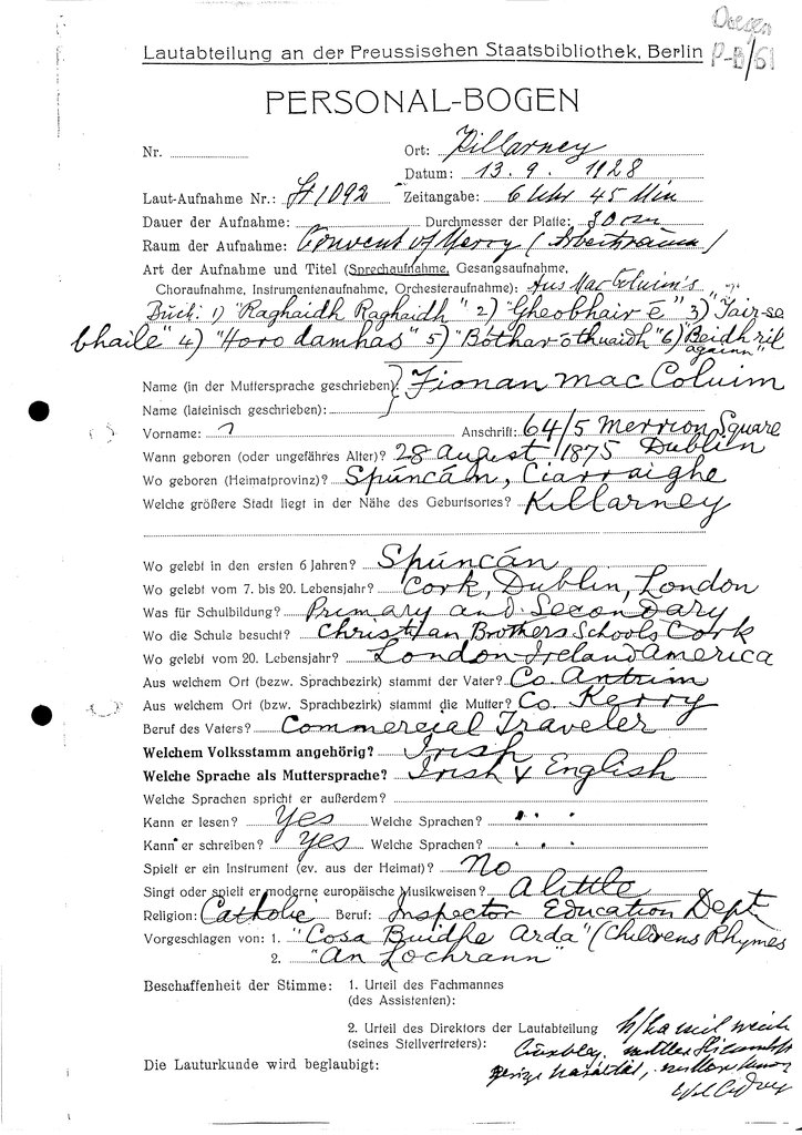 | Foirm(eacha) Personalbogen a bhaineann leis an gcainteoir seo (Tagairt Leabharlann an RIA) | Doegen P-B/61 |