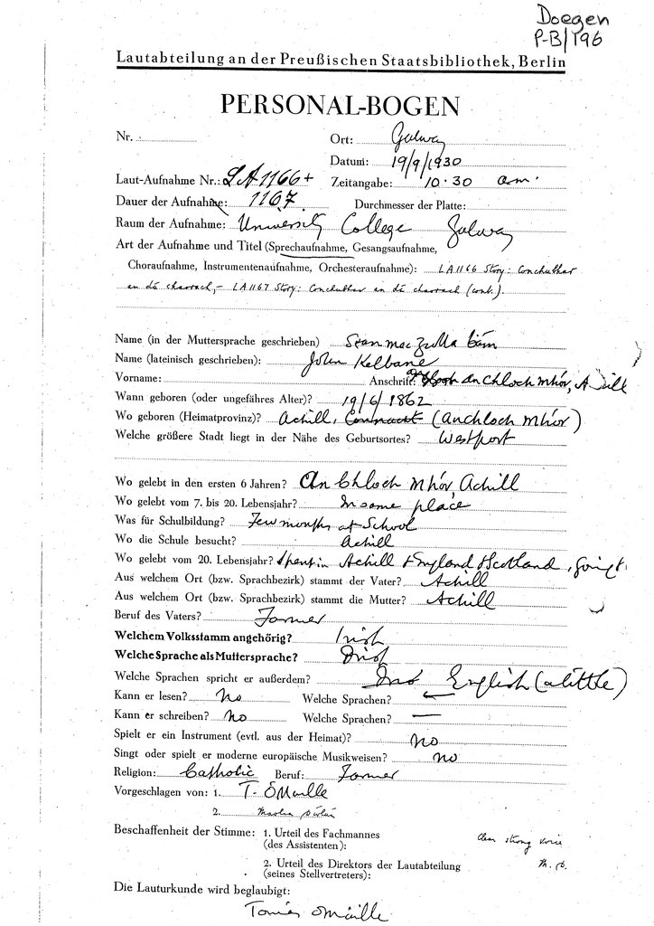 Comhlánaíodh foirm eolais phearsanta (‘Personalbogen’) do gach cainteoir ag seisiúin taifeadta Scéim Doegen 1928-31. Is as na foirmeacha sin go príomha atá an t-eolas seo thíos bainte.