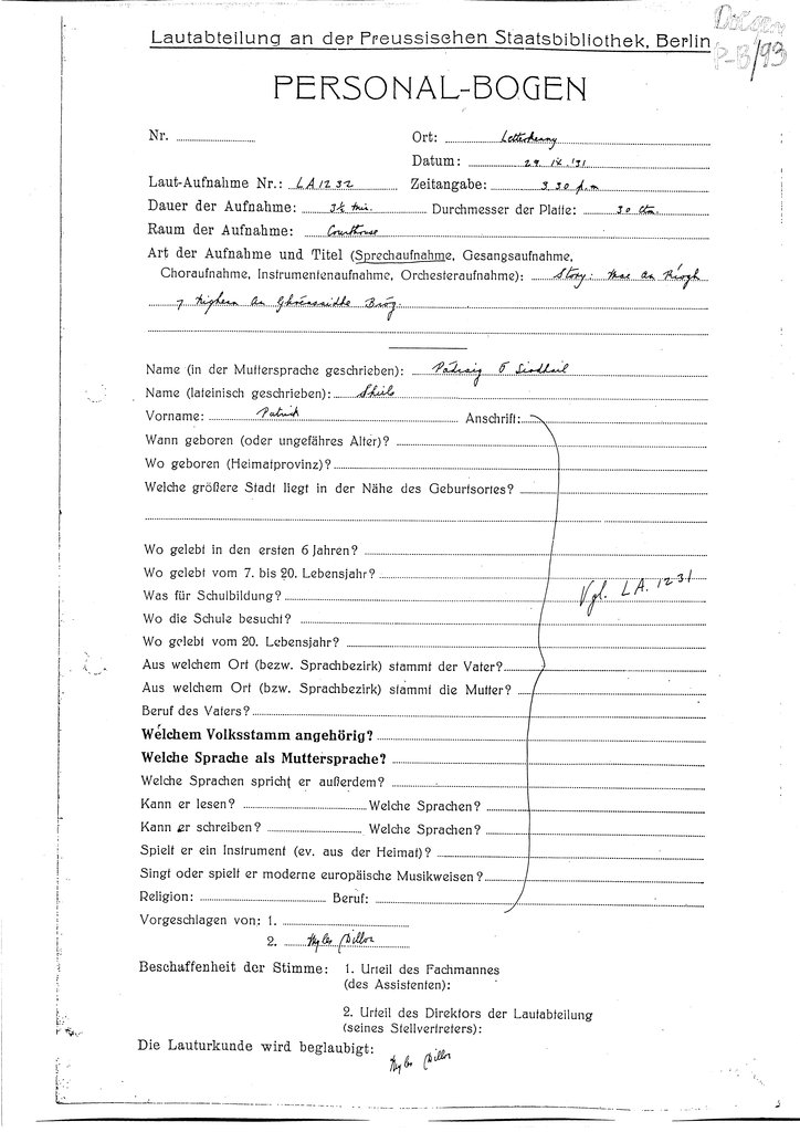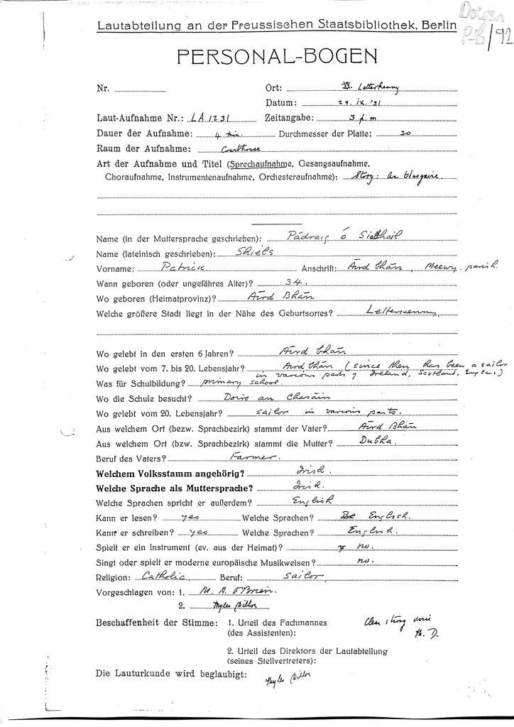 | Foirm(eacha) Personalbogen a bhaineann leis an gcainteoir seo (Tagairt Leabharlann an RIA) | Doegen P-B/92, Doegen P-B/93 |