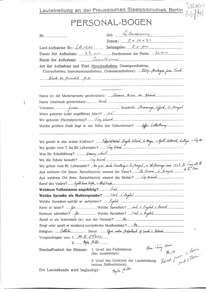 Comhlánaíodh foirm eolais phearsanta (‘Personalbogen’) do gach cainteoir ag seisiúin taifeadta Scéim Doegen 1928-31. Is as na foirmeacha sin go príomha atá an t-eolas seo thíos bainte.