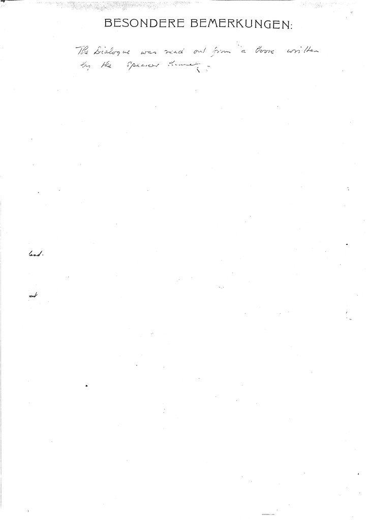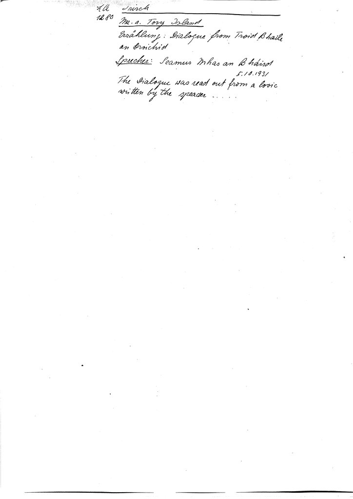 | Ráitis mar gheall ar urlabhra an chainteora srl. | "Clear strong voice." (Myles Dillon); "Read from a book. The dialogue was read out from a book written by the speaker himself." (M. A. O'Brien) |