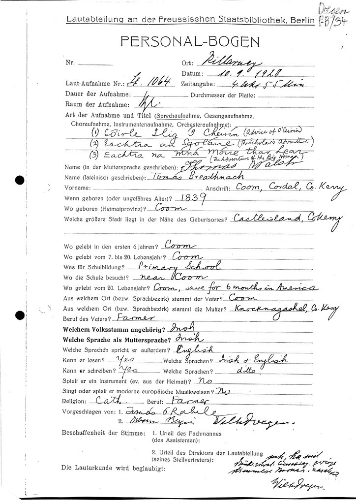 | Foirm(eacha) Personalbogen a bhaineann leis an gcainteoir seo (Tagairt Leabharlann an RIA) | Doegen P-B/34 |