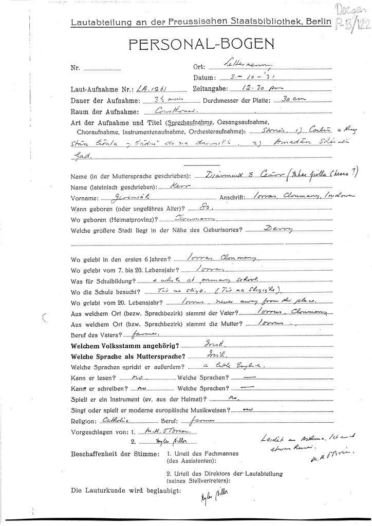 | Foirm(eacha) Personalbogen a bhaineann leis an gcainteoir seo (Tagairt Leabharlann an RIA) | Doegen P-B/122 |