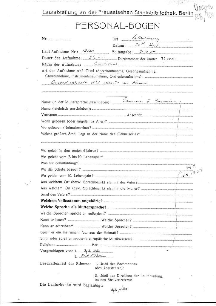 A personal details form (‘Personalbogen’) was completed for each speaker at the Doegen Scheme recording sessions 1928-31. The information displayed below is derived mainly from these forms.