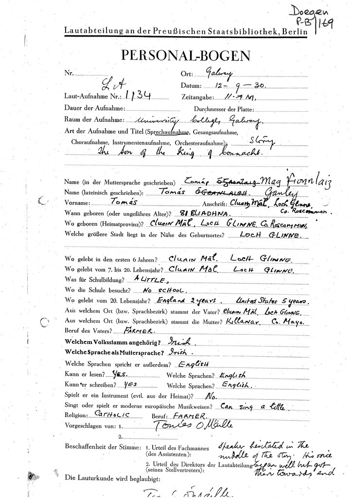 | Personalbogen form(s) for this speaker (RIA Library ref.) | Doegen P-B/169 |