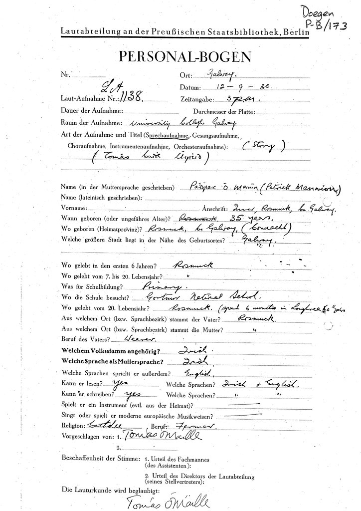 | Personalbogen form(s) for this speaker (RIA Library ref.) | Doegen P-B/173 |