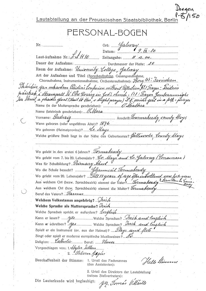 | Personalbogen form(s) for this speaker (RIA Library ref.) | Doegen P-B/150 |