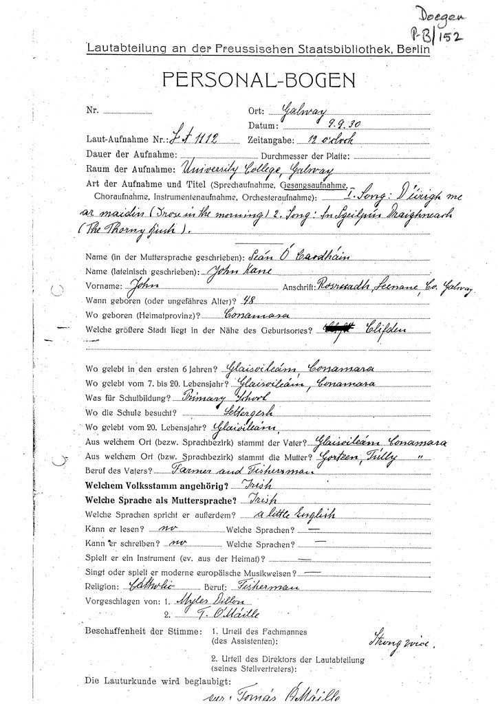 | Personalbogen form(s) for this speaker (RIA Library ref.) | Doegen P-B/152 |