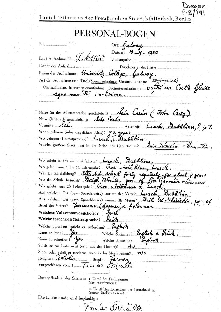 | Personalbogen form(s) for this speaker (RIA Library ref.) | Doegen P-B/191 |