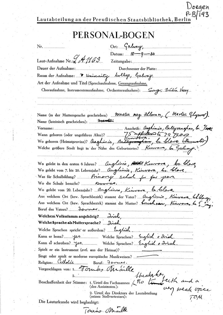 | Personalbogen form(s) for this speaker (RIA Library ref.) | Doegen P-B/193 |