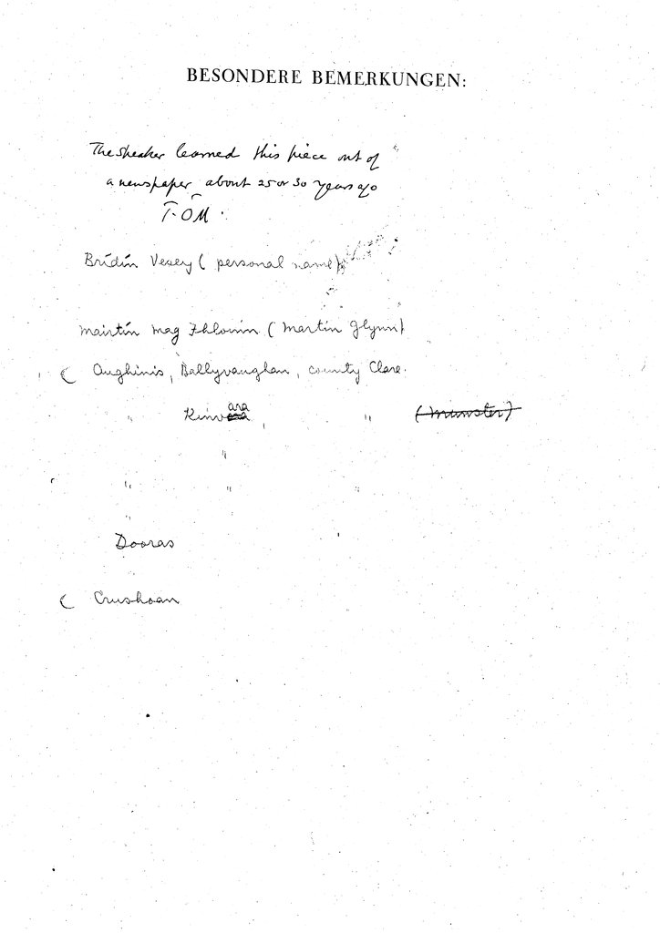 | Comment(s) on voice etc. | "Speaker has no teeth and a very weak voice. [He] learned this piece out of a newspaper about 25 or 30 years ago." (Tomás Ó Máille) |