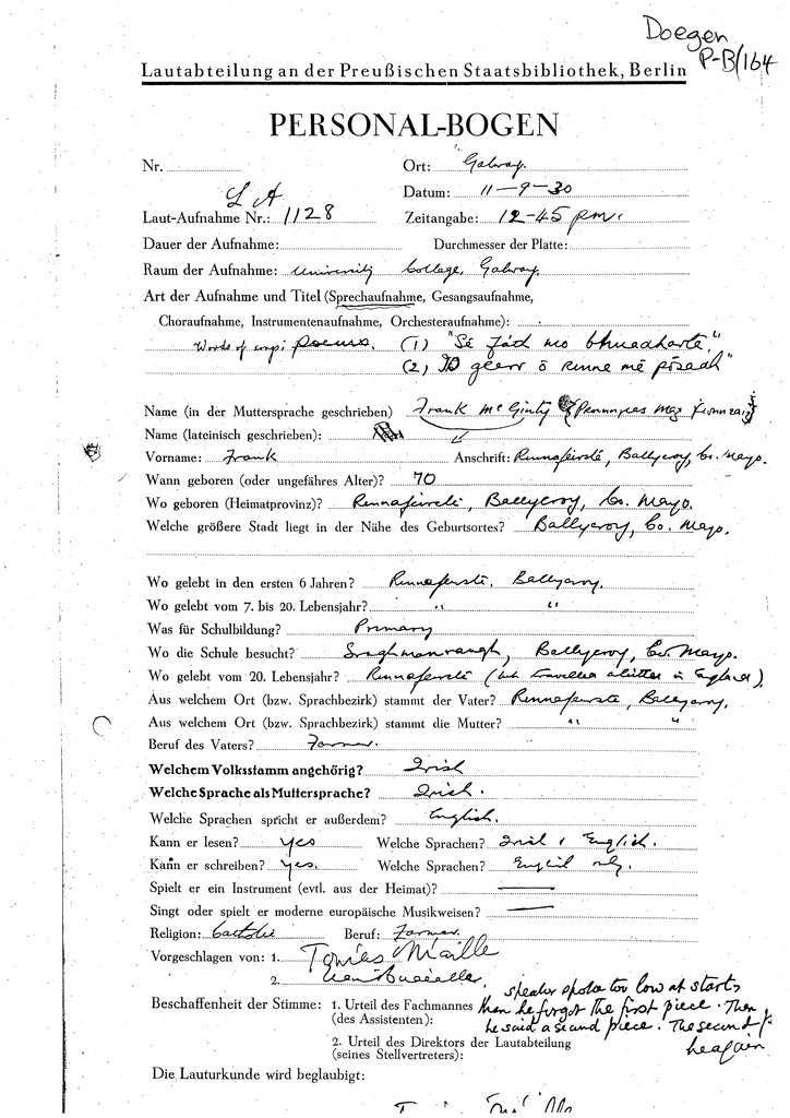 | Personalbogen form(s) for this speaker (RIA Library ref.) | Doegen P-B/164 |