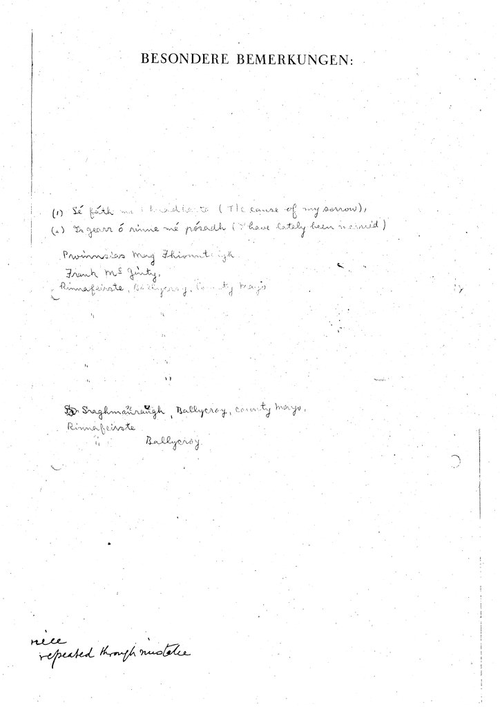 | Place(s) lived from age 20 | Rinn na Feirste (?), Co. Mayo, but travelled a little in England. |