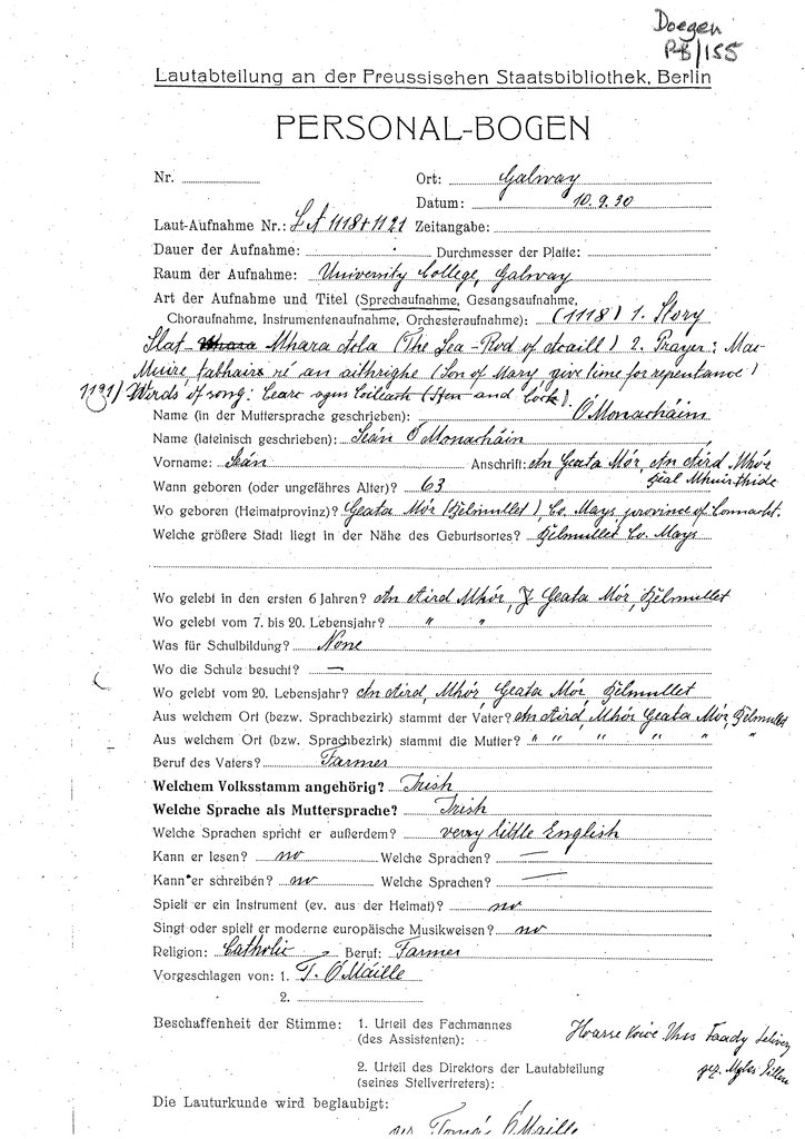 | Personalbogen form(s) for this speaker (RIA Library ref.) | Doegen P-B/155 |