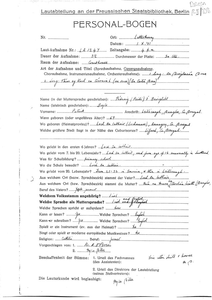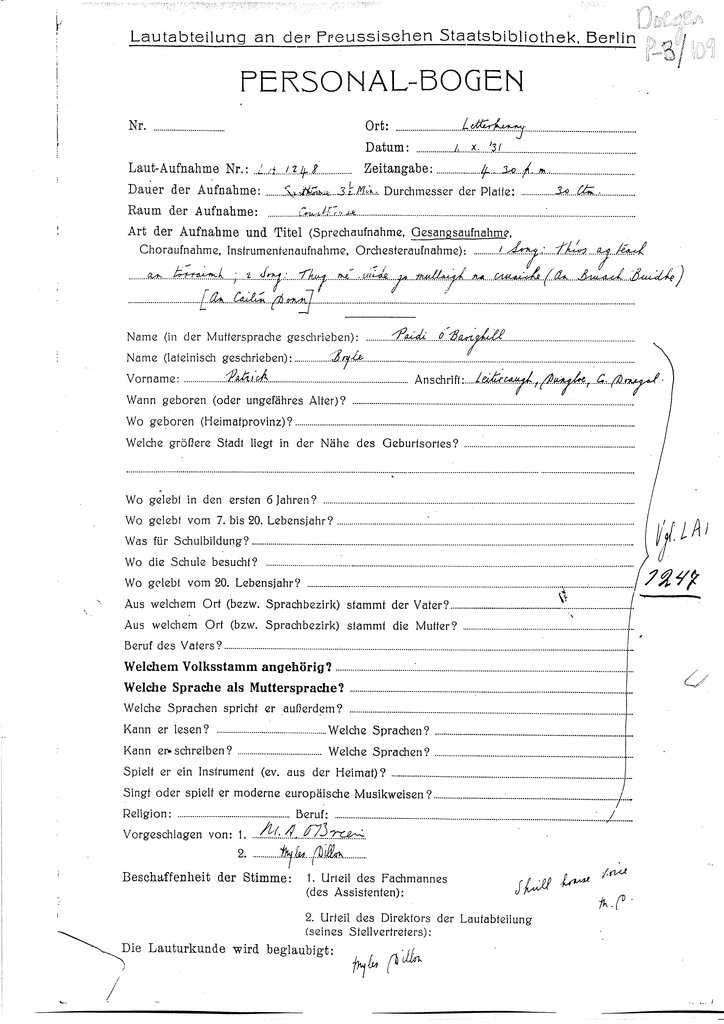 | Personalbogen form(s) for this speaker (RIA Library ref.) | Doegen P-B/108, Doegen P-B/109 |
