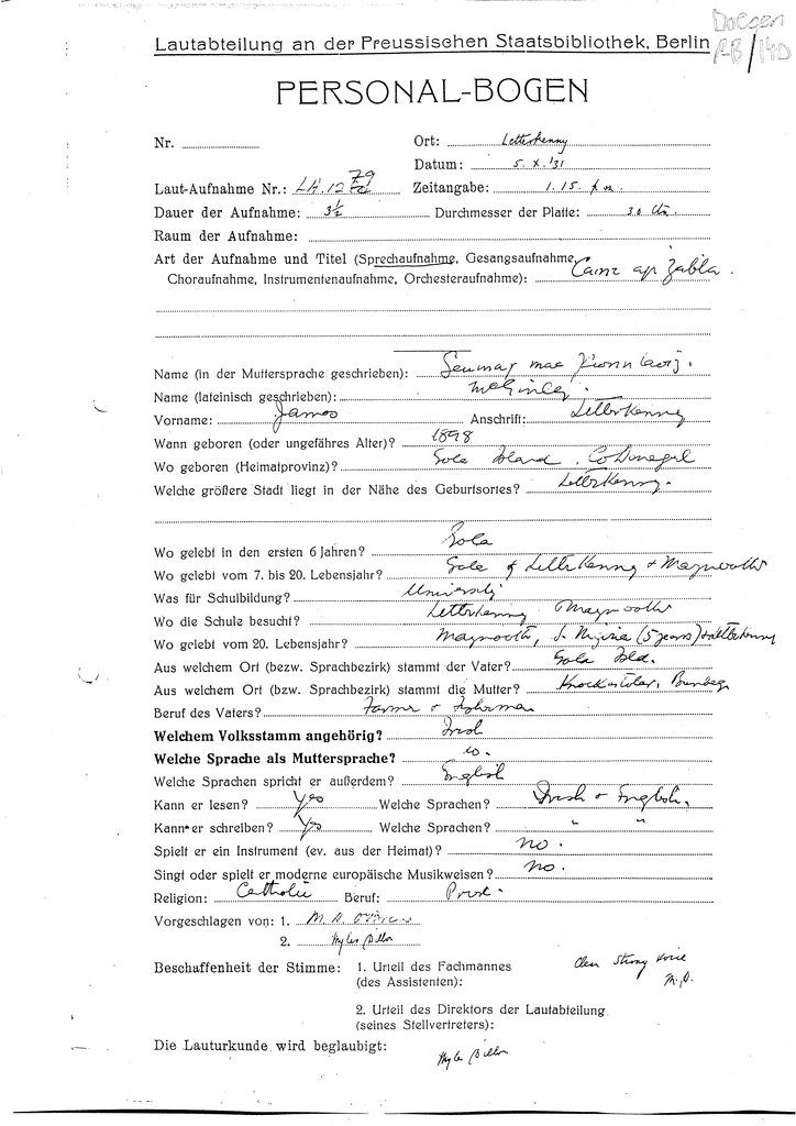| Personalbogen form(s) for this speaker (RIA Library ref.) | Doegen P-B/140 |