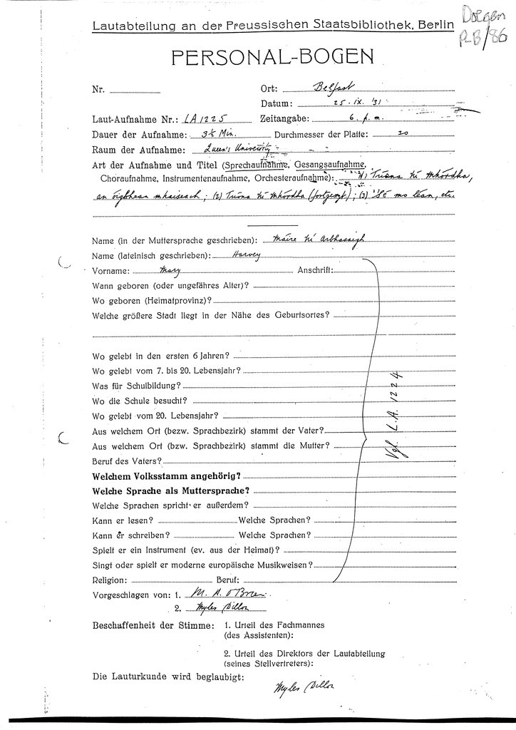 | Names (of RIA committee members, recordist) appearing on form | Myles Dillon, Éamonn Ó Tuathail |