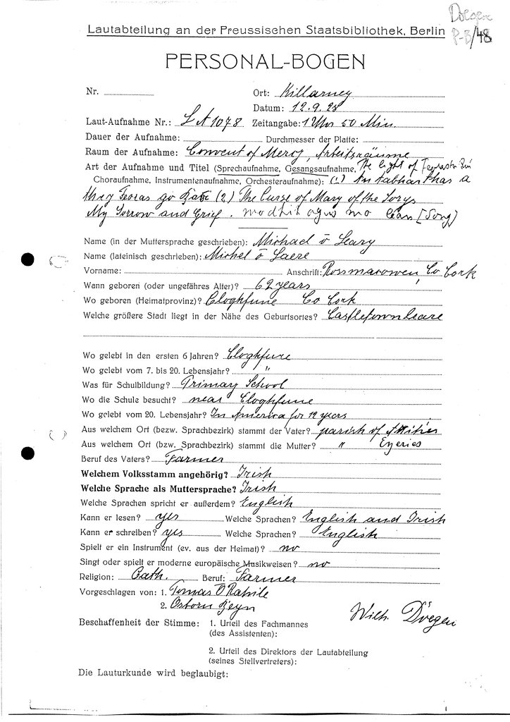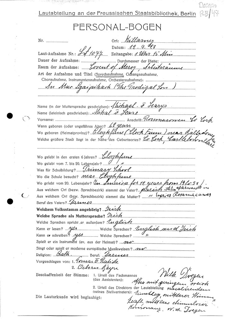 | Names (of RIA committee members, recordist) appearing on form | Osborn Bergin, Wilhelm Doegen, Tomás Ó Rathile |