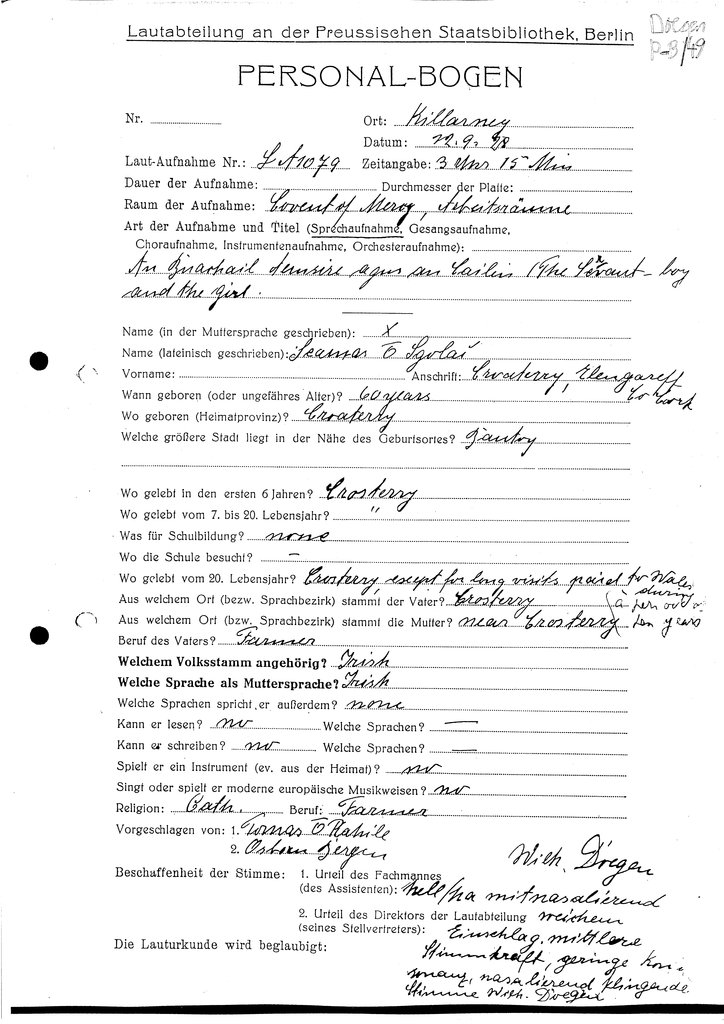 | Names (of RIA committee members, recordist) appearing on form | Osborn Bergin, Wilhelm Doegen, Tomás Ó Rathile |