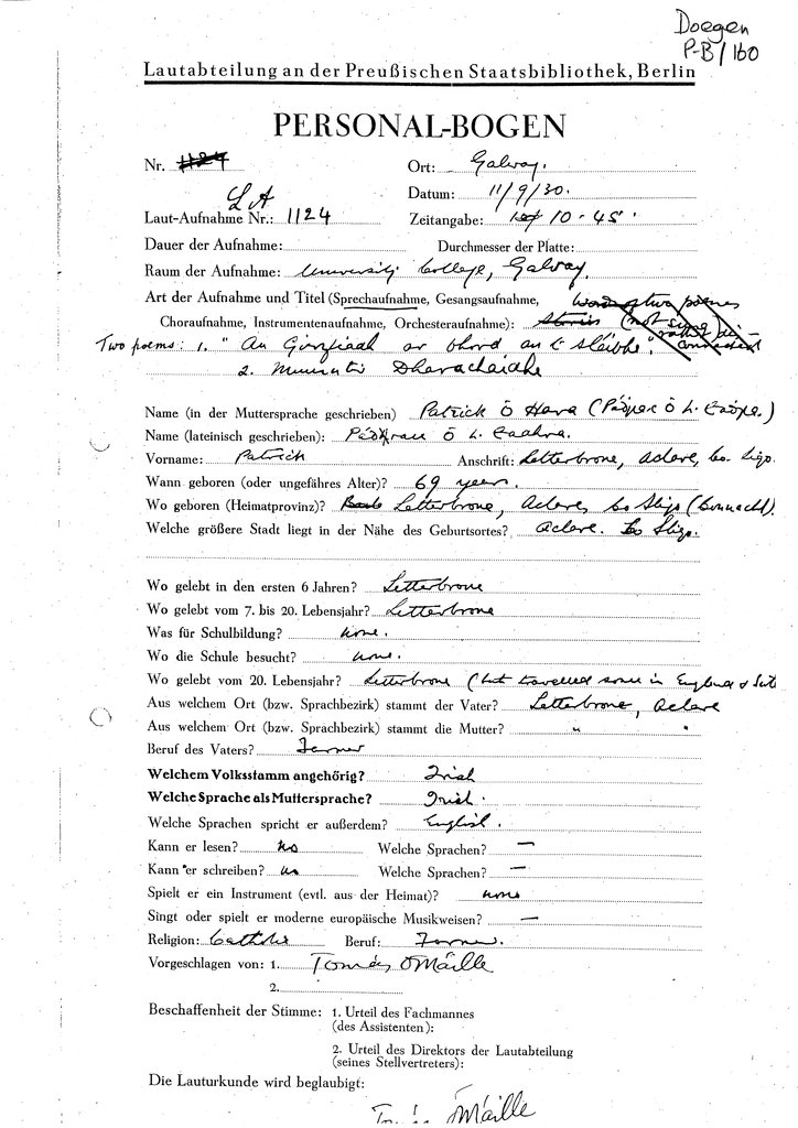 | Personalbogen form(s) for this speaker (RIA Library ref.) | Doegen P-B/160 |