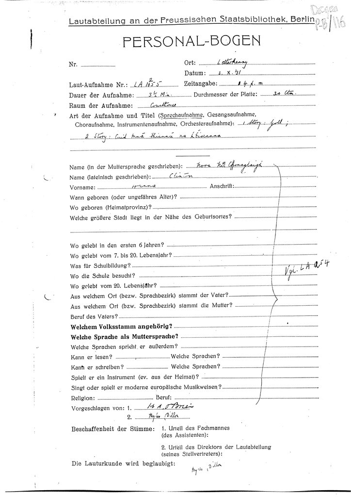 A personal details form (‘Personalbogen’) was completed for each speaker at the Doegen Scheme recording sessions 1928-31. The information displayed below is derived mainly from these forms.
