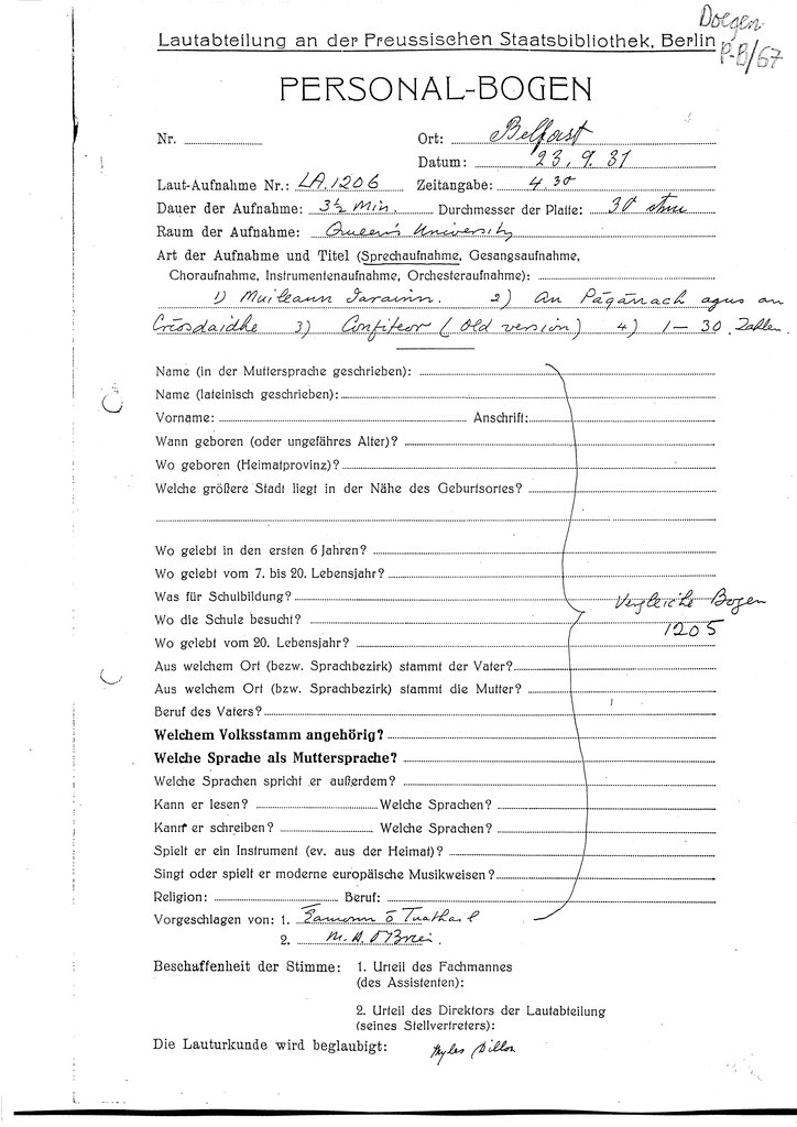 A personal details form (‘Personalbogen’) was completed for each speaker at the Doegen Scheme recording sessions 1928-31. The information displayed below is derived mainly from these forms.