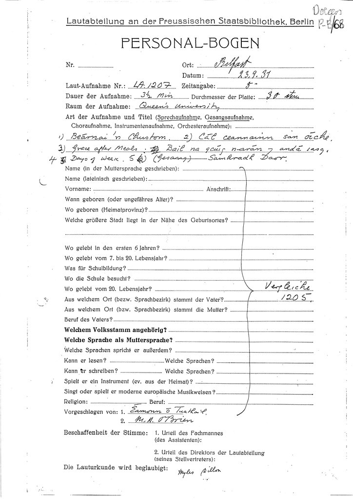 | Names (of RIA committee members, recordist) appearing on form | Myles Dillon, M.A. O'Brien, Éamonn Ó Tuathail |