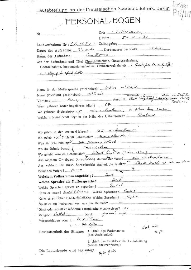 | Personalbogen form(s) for this speaker (RIA Library ref.) | Doegen P-B/142 |
