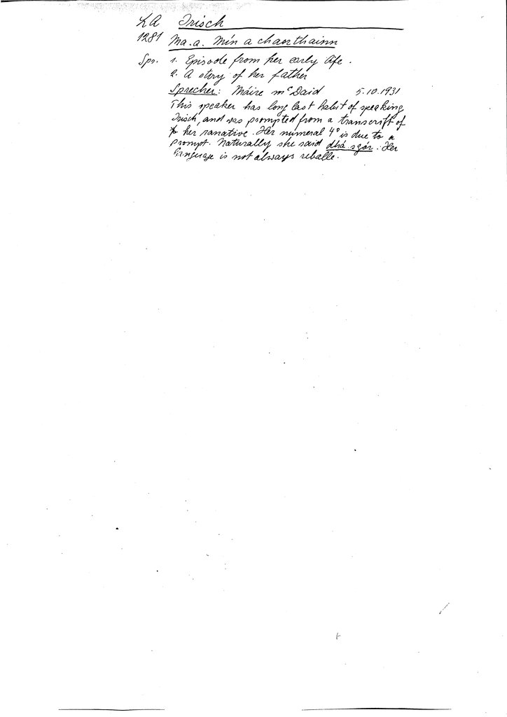 | Comment(s) on voice etc. | "Weak voice. This speaker has long lost the habit of speaking Irish, and was prompted from a transcript of her narrative. Her numeral 40 is due to a prompt. Naturally she said dhá sgór. Her language is not always reliable." (Myles Dillon) |