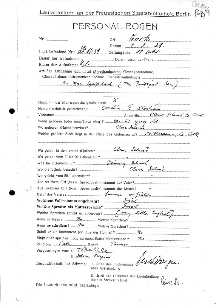 | Names (of RIA committee members, recordist) appearing on form | Tadhg Ó Donnchadha, Wilhelm Doegen, Tomás Ó Rathile |