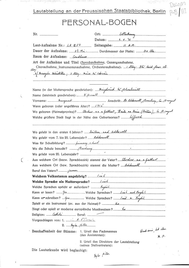 | Personalbogen form(s) for this speaker (RIA Library ref.) | Doegen P-B/111, Doegen P-B/112 |