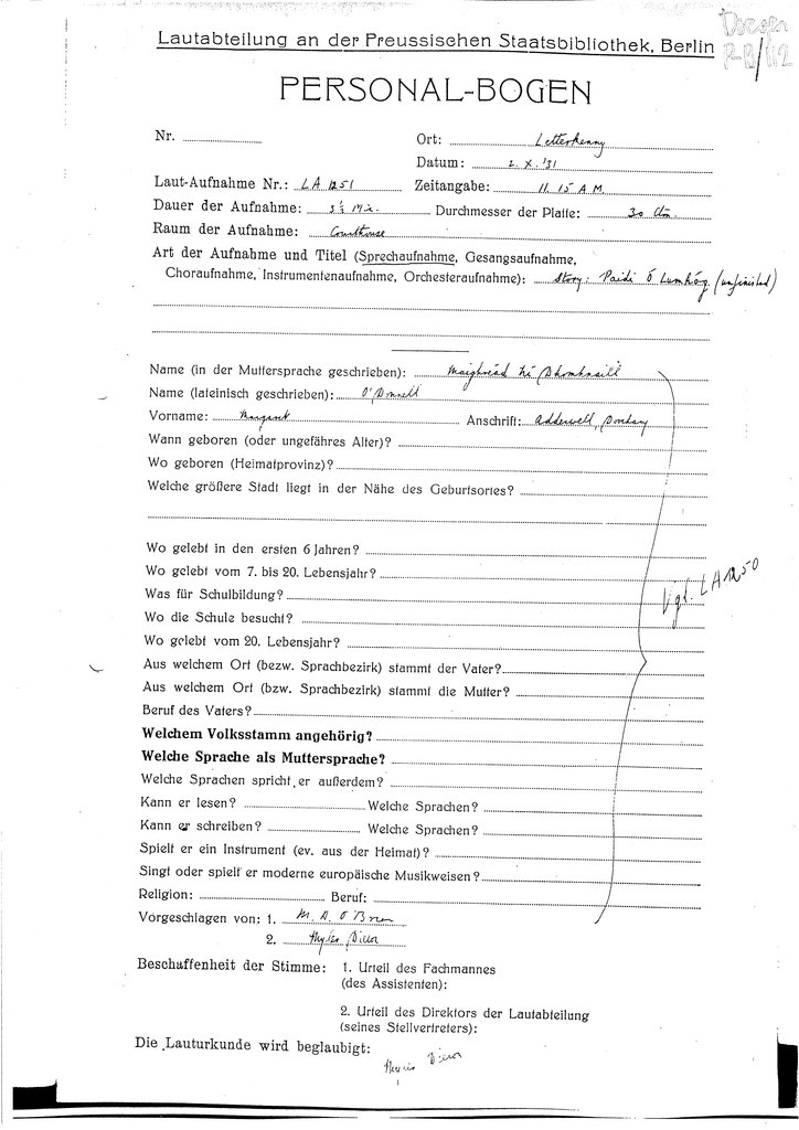 A personal details form (‘Personalbogen’) was completed for each speaker at the Doegen Scheme recording sessions 1928-31. The information displayed below is derived mainly from these forms.