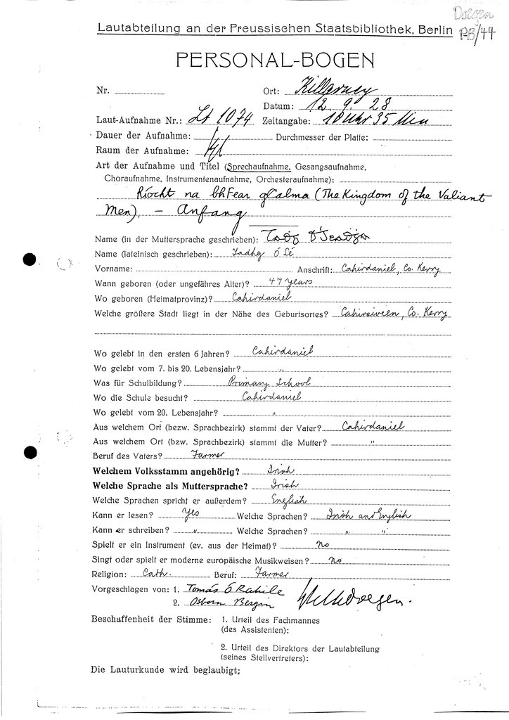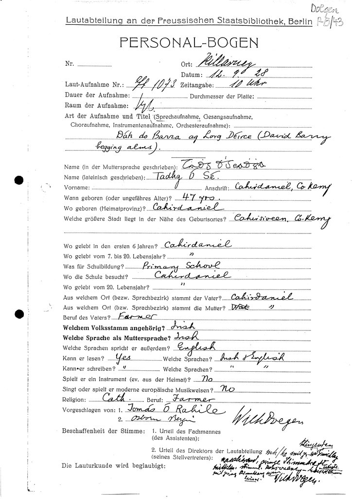 | Names (of RIA committee members, recordist) appearing on form | Osborn Bergin, Wilhelm Doegen, Tomás Ó Rathile |