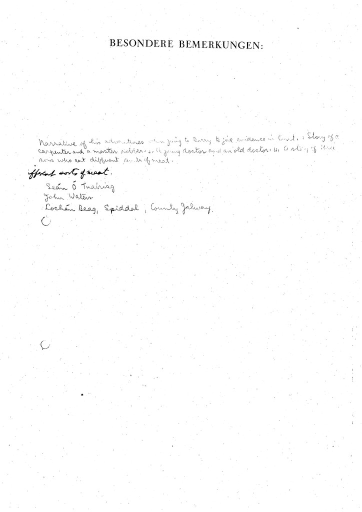 | Place(s) lived from age 20 | Loughaun Beg, Spiddle, Co. Galway |