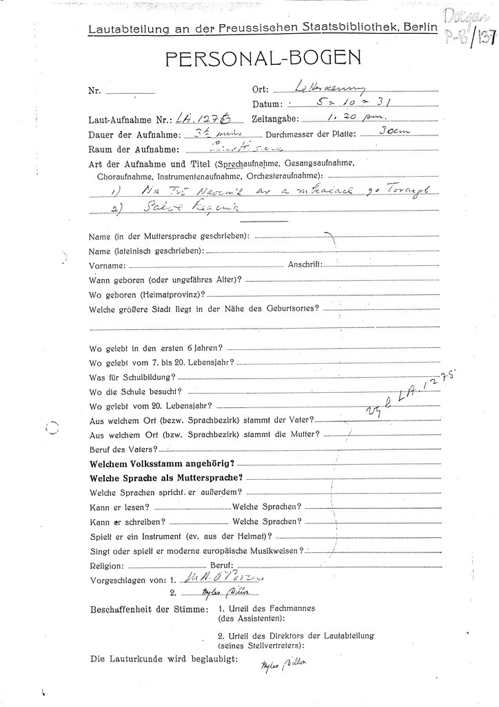 A personal details form (‘Personalbogen’) was completed for each speaker at the Doegen Scheme recording sessions 1928-31. The information displayed below is derived mainly from these forms.