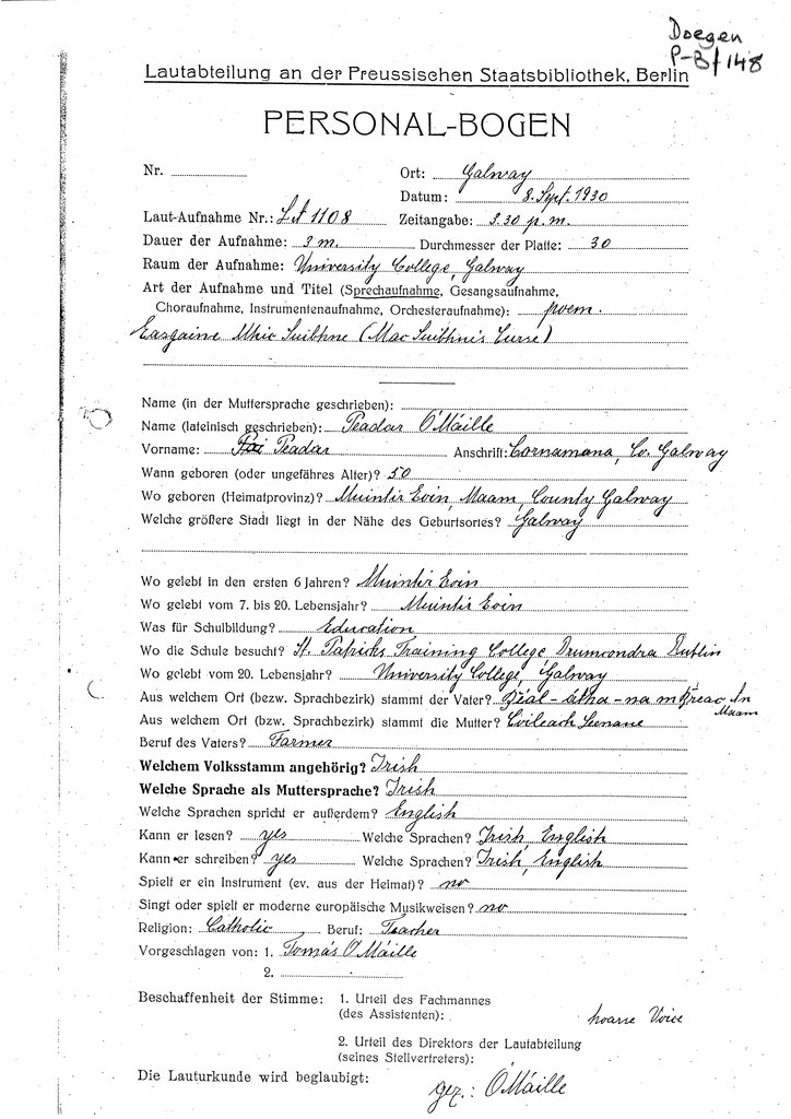 | Foirm(eacha) Personalbogen a bhaineann leis an gcainteoir seo (Tagairt Leabharlann an RIA) | Doegen P-B/148 |