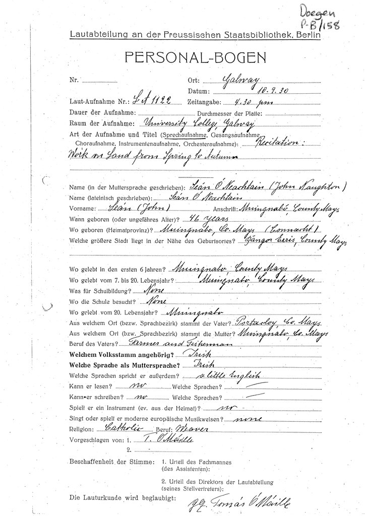 | Foirm(eacha) Personalbogen a bhaineann leis an gcainteoir seo (Tagairt Leabharlann an RIA) | Doegen P-B/158 |