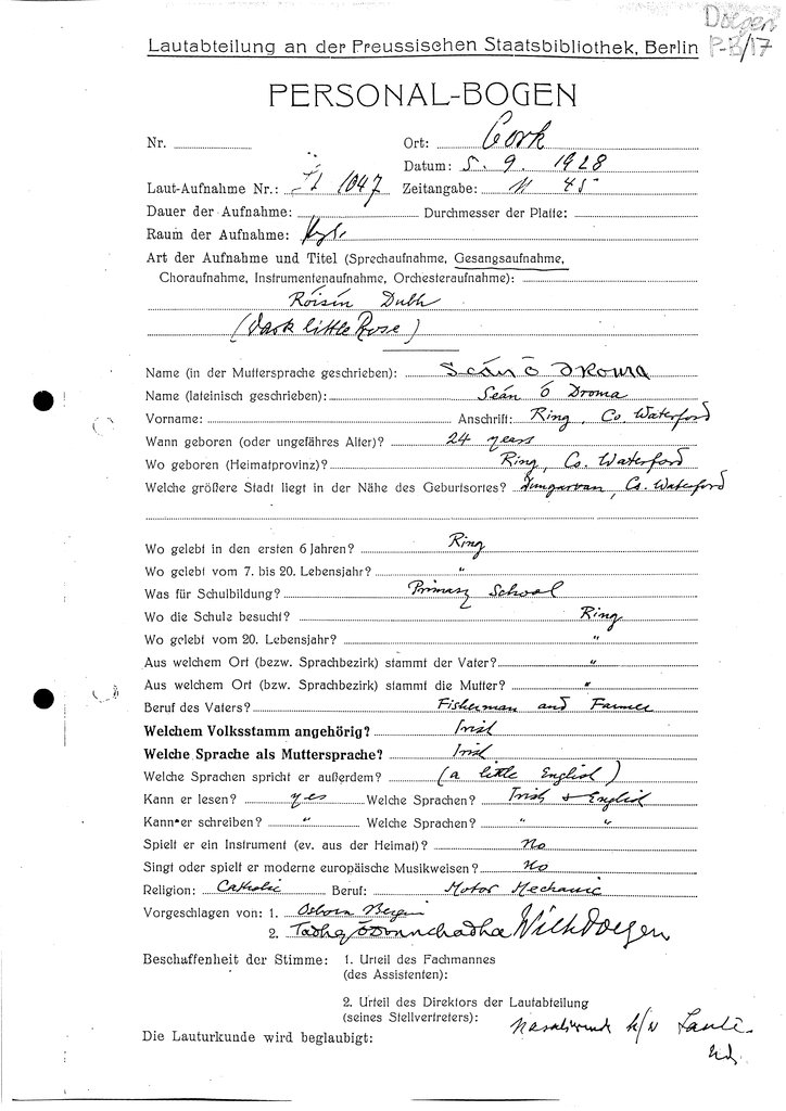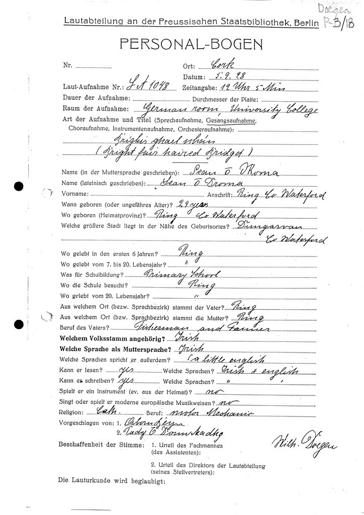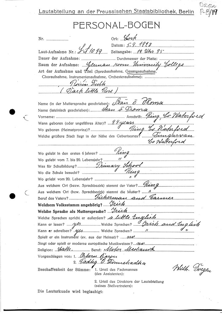 | Foirm(eacha) Personalbogen a bhaineann leis an gcainteoir seo (Tagairt Leabharlann an RIA) | Doegen P-B/17, Doegen P-B/18, Doegen P-B/19 |