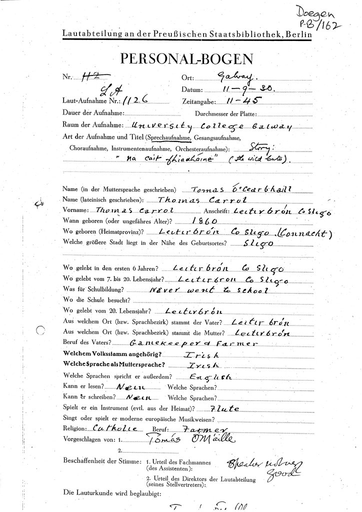 | Foirm(eacha) Personalbogen a bhaineann leis an gcainteoir seo (Tagairt Leabharlann an RIA) | Doegen P-B/162 |