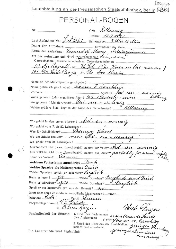 | Foirm(eacha) Personalbogen a bhaineann leis an gcainteoir seo (Tagairt Leabharlann an RIA) | Doegen P-B/31 |