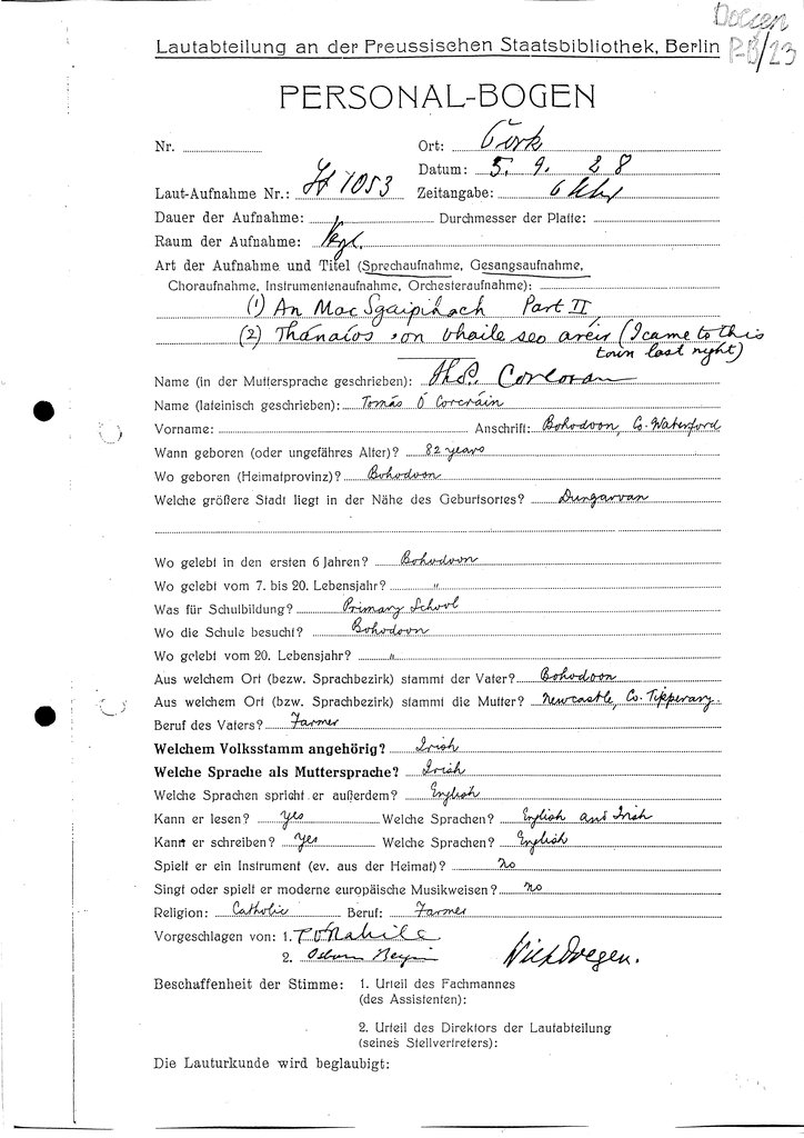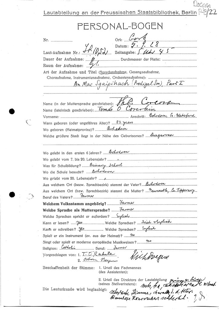 | Foirm(eacha) Personalbogen a bhaineann leis an gcainteoir seo (Tagairt Leabharlann an RIA) | Doegen P-B/22, Doegen P-B/23 |