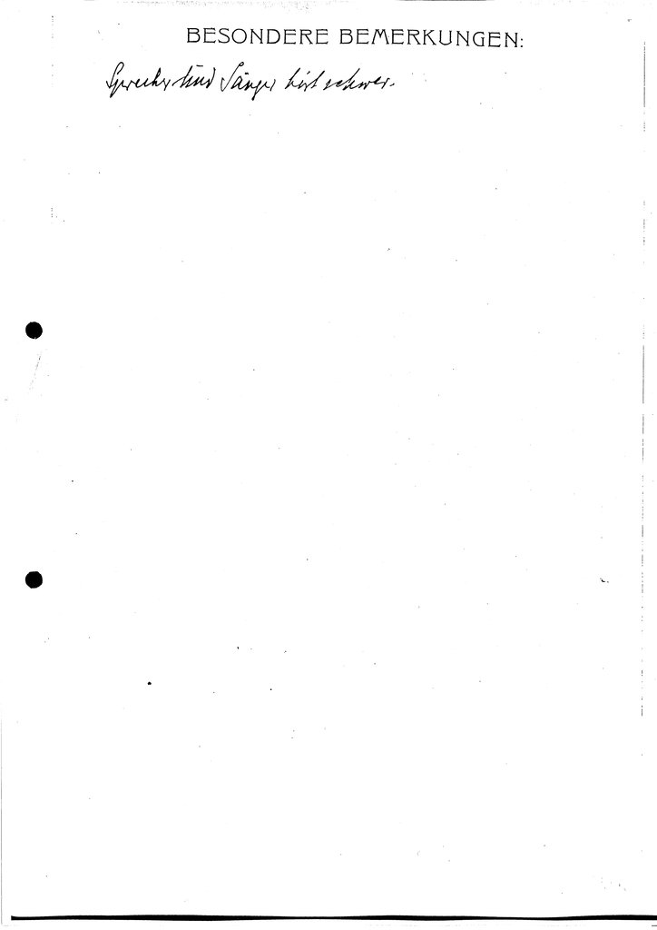 | Ráitis mar gheall ar urlabhra an chainteora srl. | "mh, ka, gering w[eichem] Einsch[la]g. nasalisierende vibrat. schwache Stimme, charakterl. d[es] Alters stimmlose Konsonant schlecht. Sprecher und Sänger hört schwer." (Wilhelm Doegen) |
