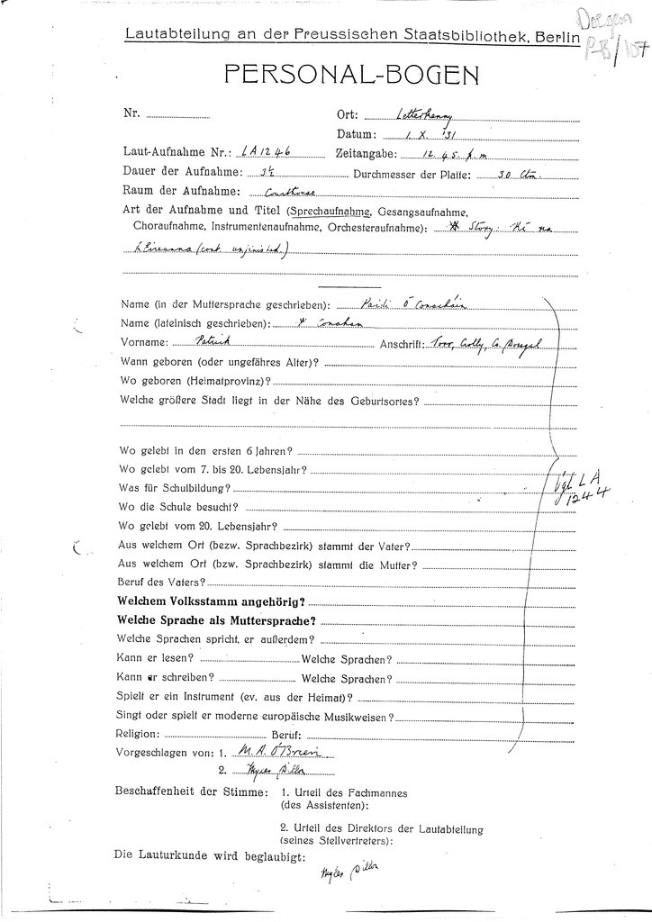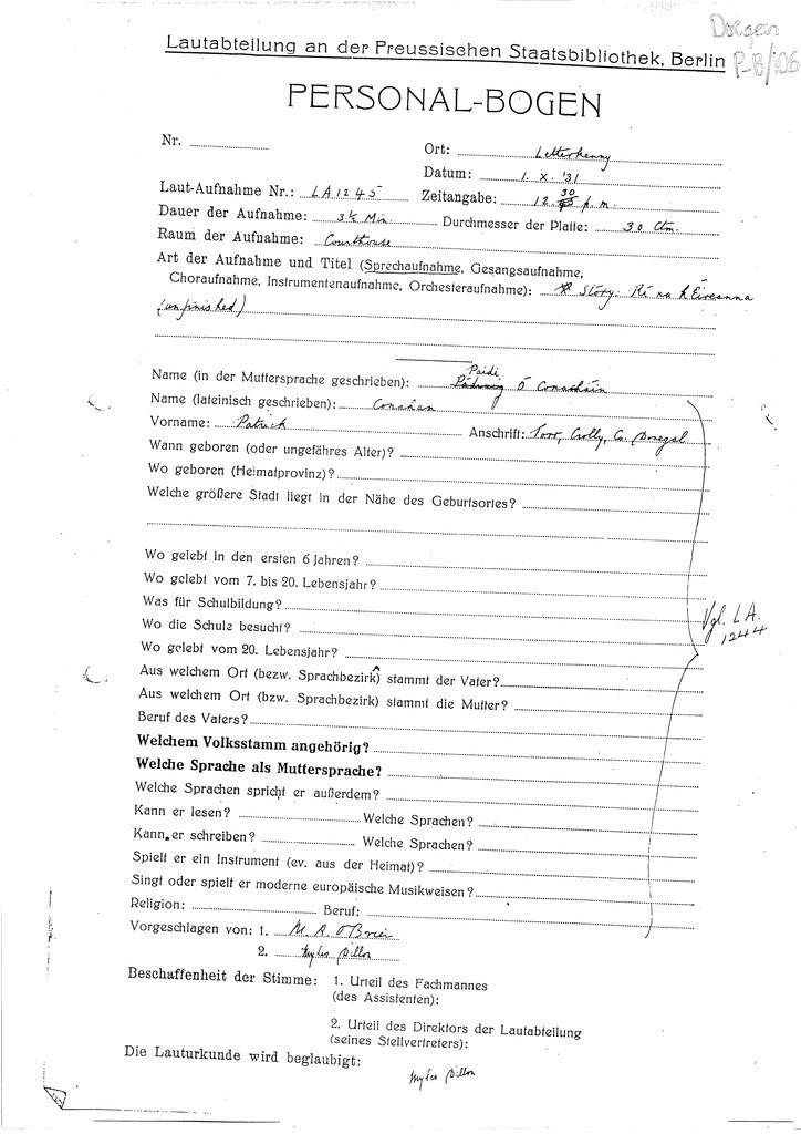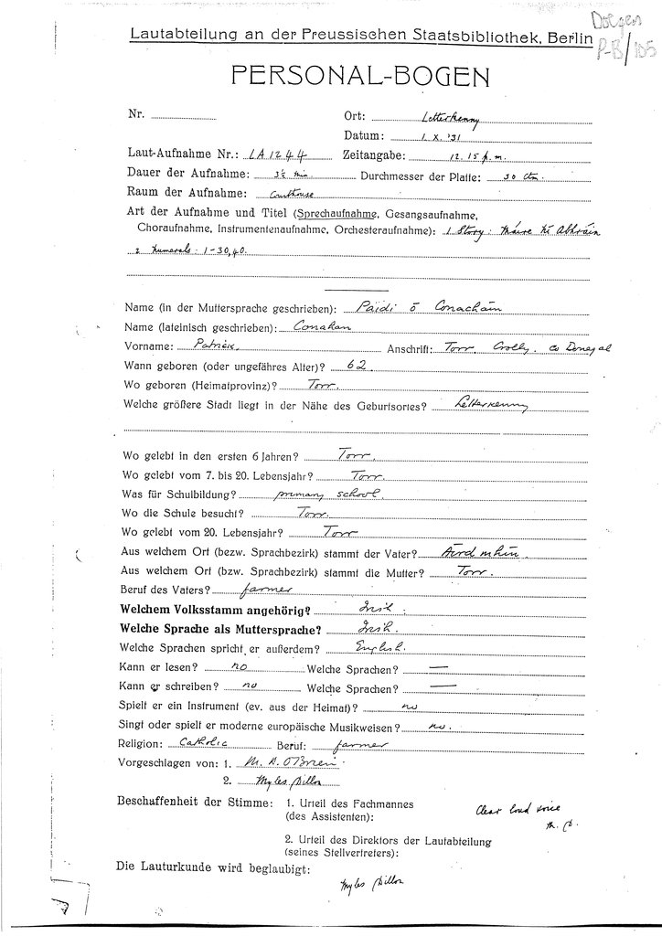| Foirm(eacha) Personalbogen a bhaineann leis an gcainteoir seo (Tagairt Leabharlann an RIA) | Doegen P-B/105, Doegen P-B/106, Doegen P-B/107 |