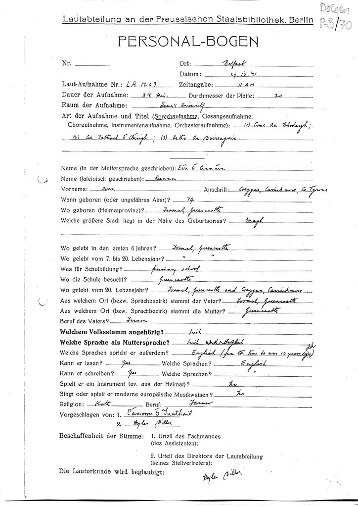 | Personalbogen form(s) for this speaker (RIA Library ref.) | Doegen P-B/70, Doegen P-B/71, Doegen P-B/72, Doegen P-B/73 |