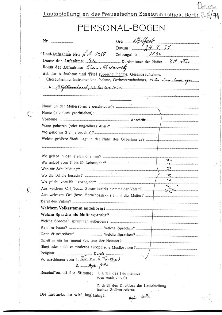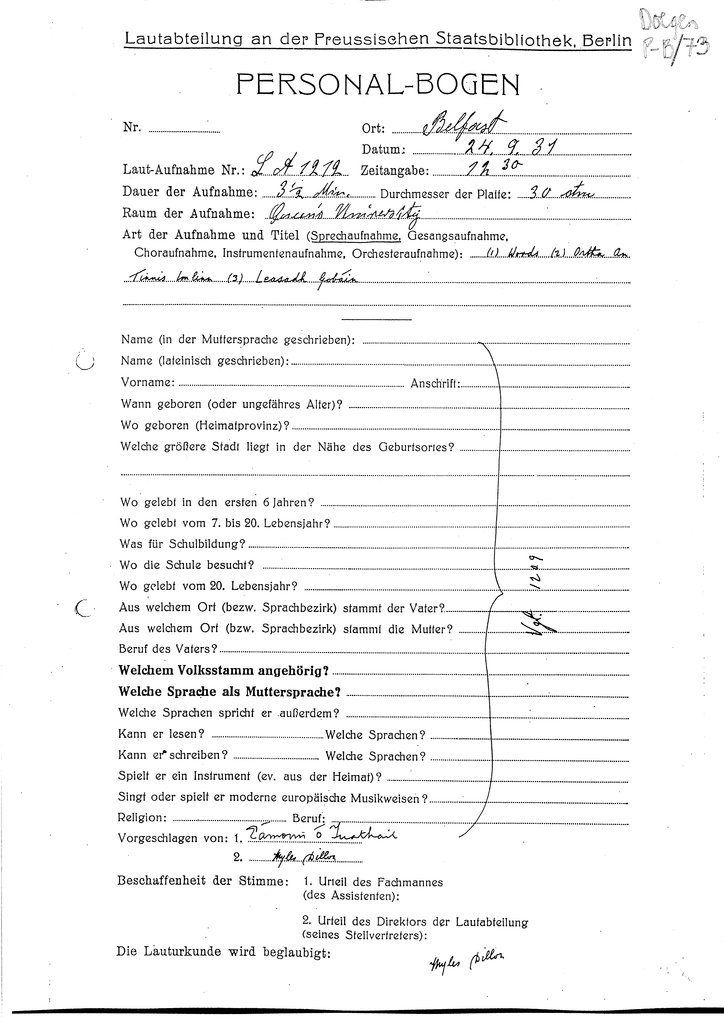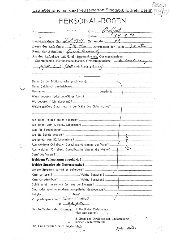 A personal details form (‘Personalbogen’) was completed for each speaker at the Doegen Scheme recording sessions 1928-31. The information displayed below is derived mainly from these forms.