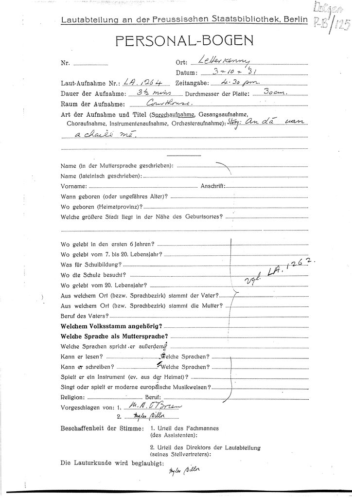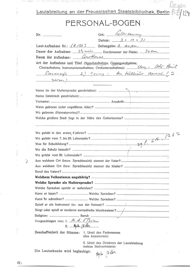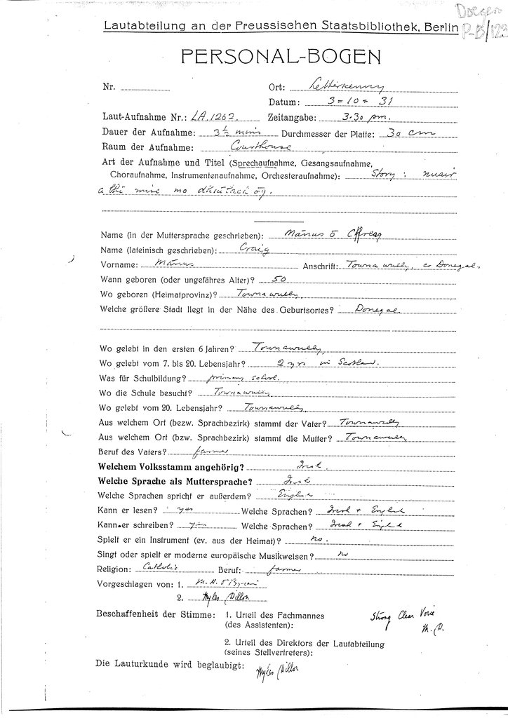 | Personalbogen form(s) for this speaker (RIA Library ref.) | Doegen P-B/123, Doegen P-B/124, Doegen P-B/125 |