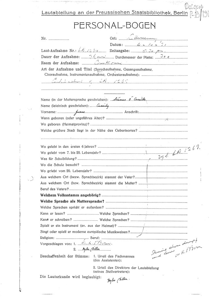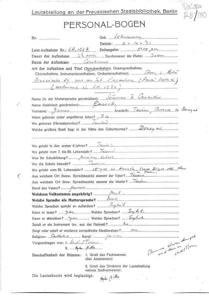 A personal details form (‘Personalbogen’) was completed for each speaker at the Doegen Scheme recording sessions 1928-31. The information displayed below is derived mainly from these forms.